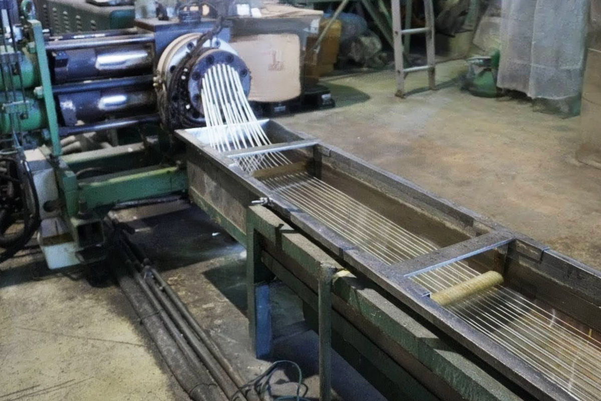 押し出された棒状の樹脂は、水槽をくぐることにより、冷却され固まります。